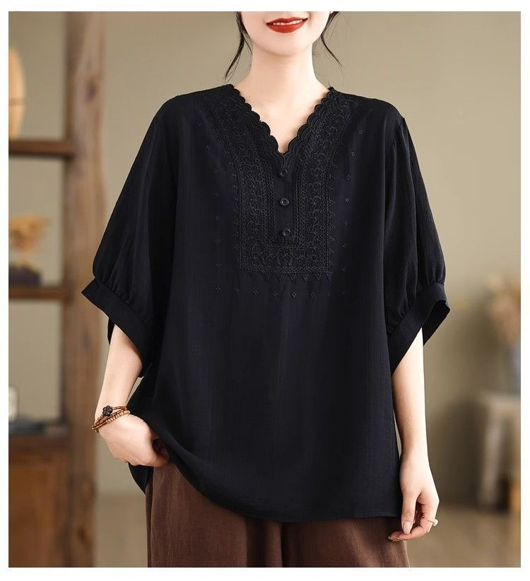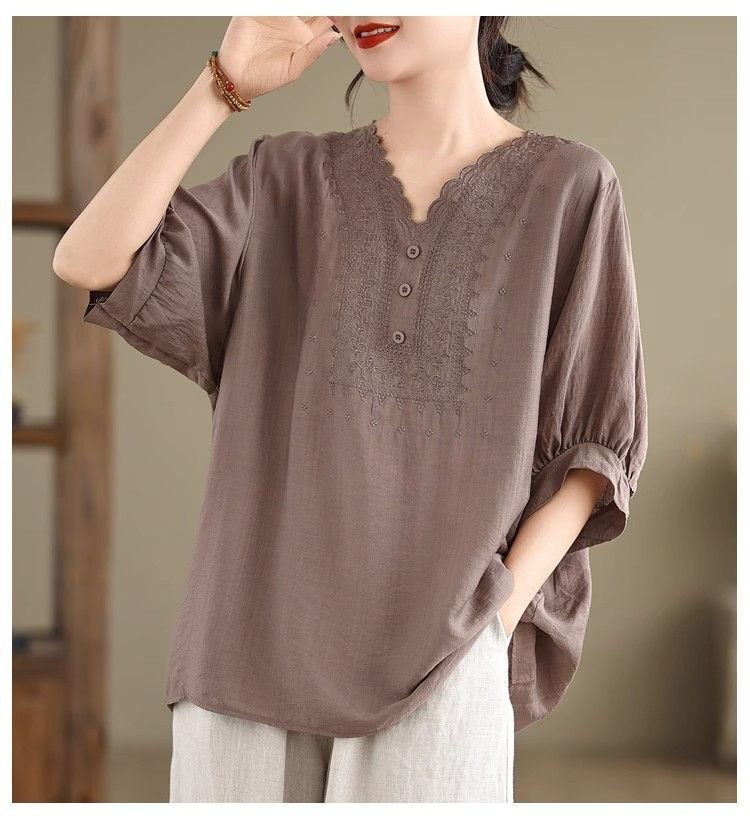 ゆったりレトロ大きめサイズVネック半袖シャツ女性用