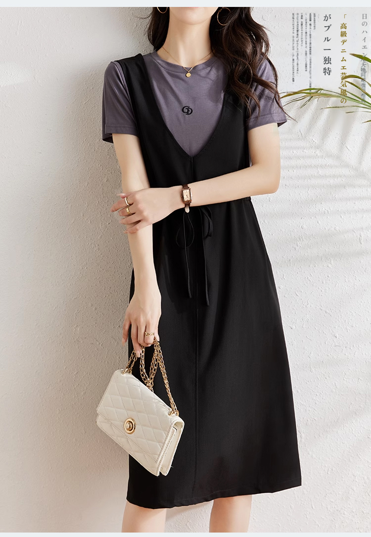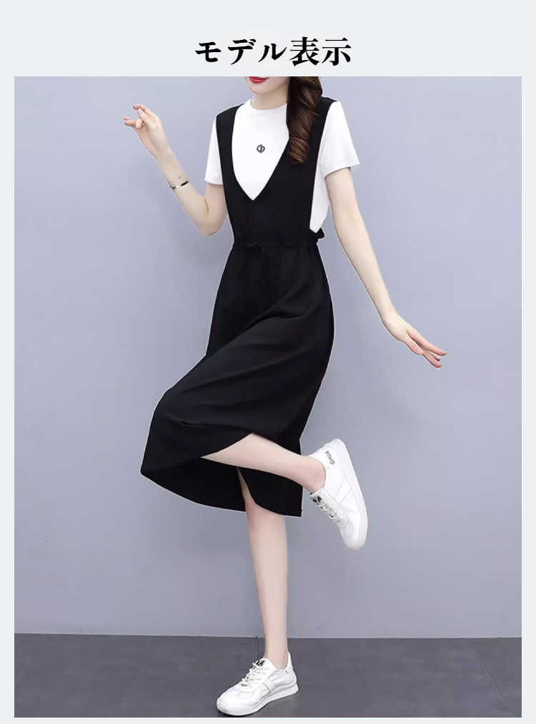 ゆったりシルエット夏用サロペットワンピース ミディカジュアルワンピース フェイクレイヤードデザイン